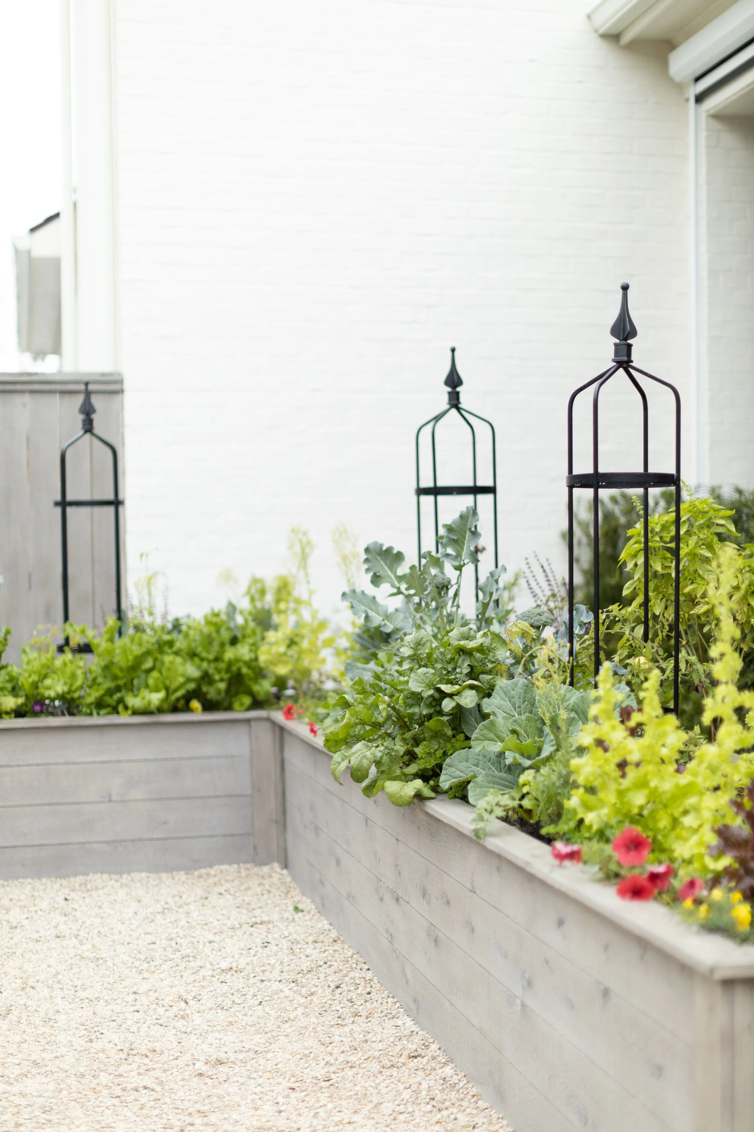 The obelisk trellises provide a stunning décor accent, but provide an important function for growing tomatoes, cucumbers, peas and beans.
