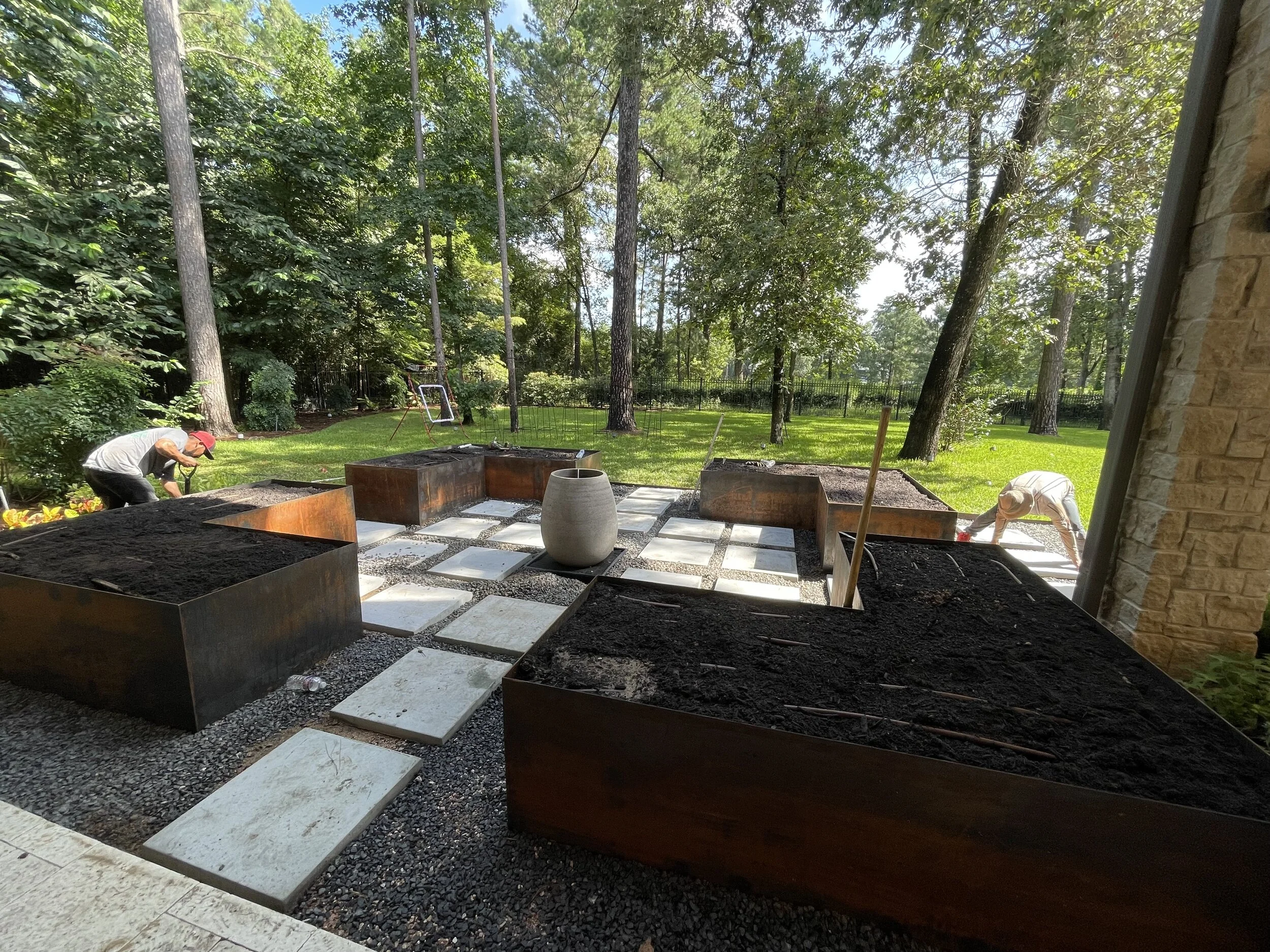 Once the hardscape is completed the custom made steel gardens are delivered and placed. Rooted Garden works with a local steel artist who custom makes all of our steel raised gardens based on the clients space and preferences. They are truly a work of art!